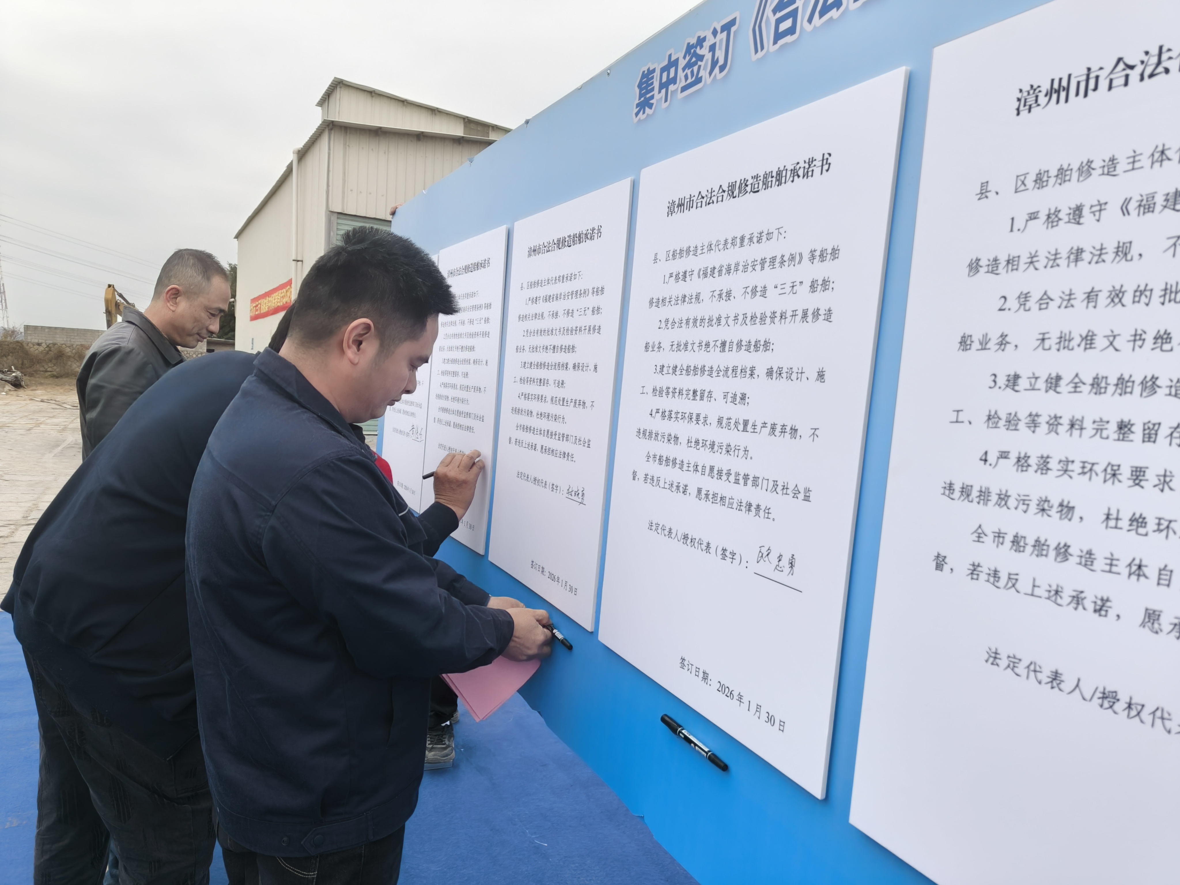 现场会上,全体参会的船舶修造企业负责人逐一签订《合规修造船舶承诺书》。漳浦县兴和船舶有限公司从制度建设、人员保障、硬件升级、数字化管理等方面交流合法合规修造船舶做法和经验;漳州市升达船舶有限公司、东山县建雄船舶修造有限公司作了表态发言。他们表示,“以前只知道不能违法造船,今天到现场亲眼看到这么多违法建造船舶被集中拆解,更进一步感受到政府打击“三无”船舶的决心,认识到自己与依规经营企业之间的差距,对过往存在的违法修造行为深感惭愧。今后我们将严格遵守船舶修造审批流程,健全‘一船一档’管理制度,坚决杜绝违法违规行为。”