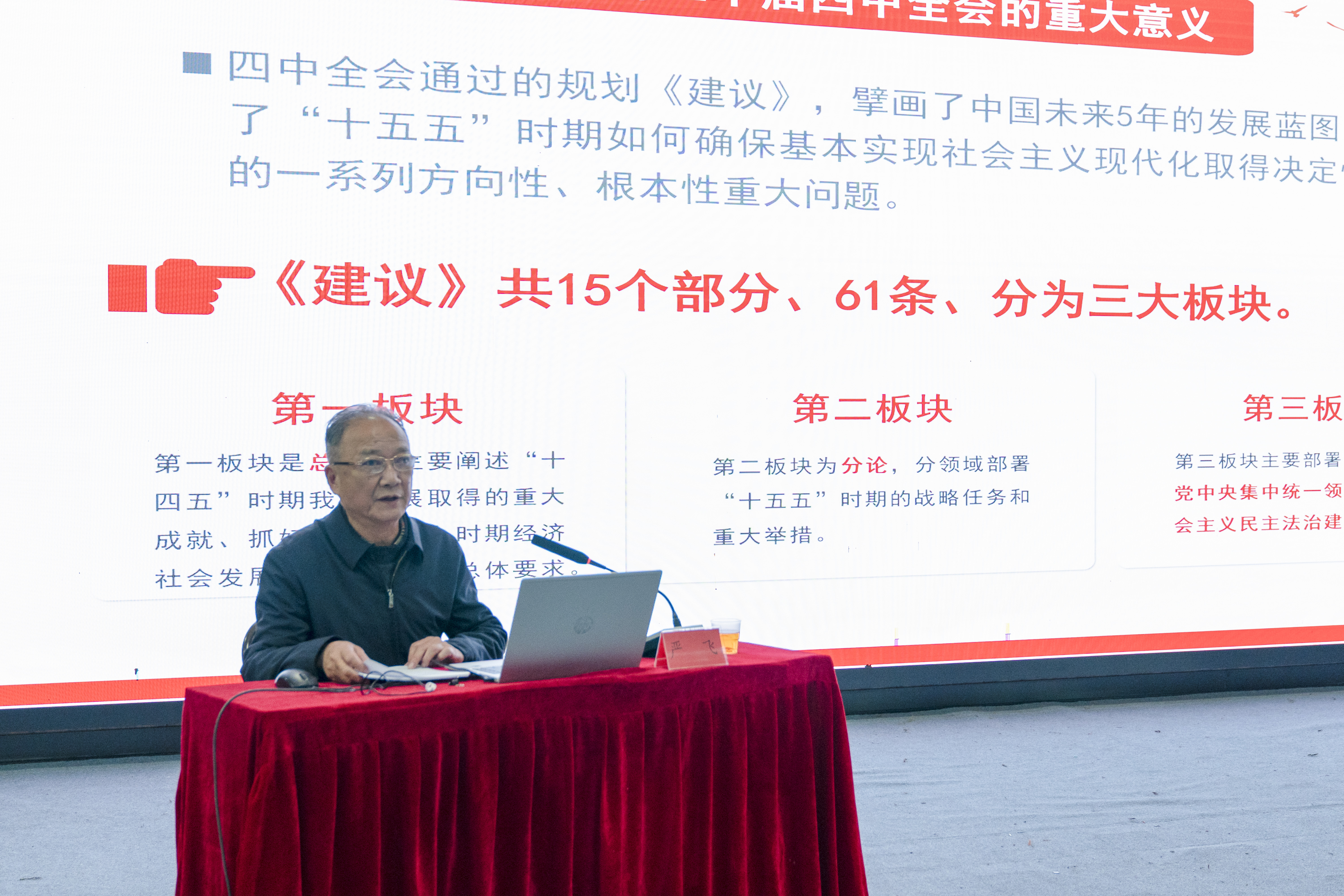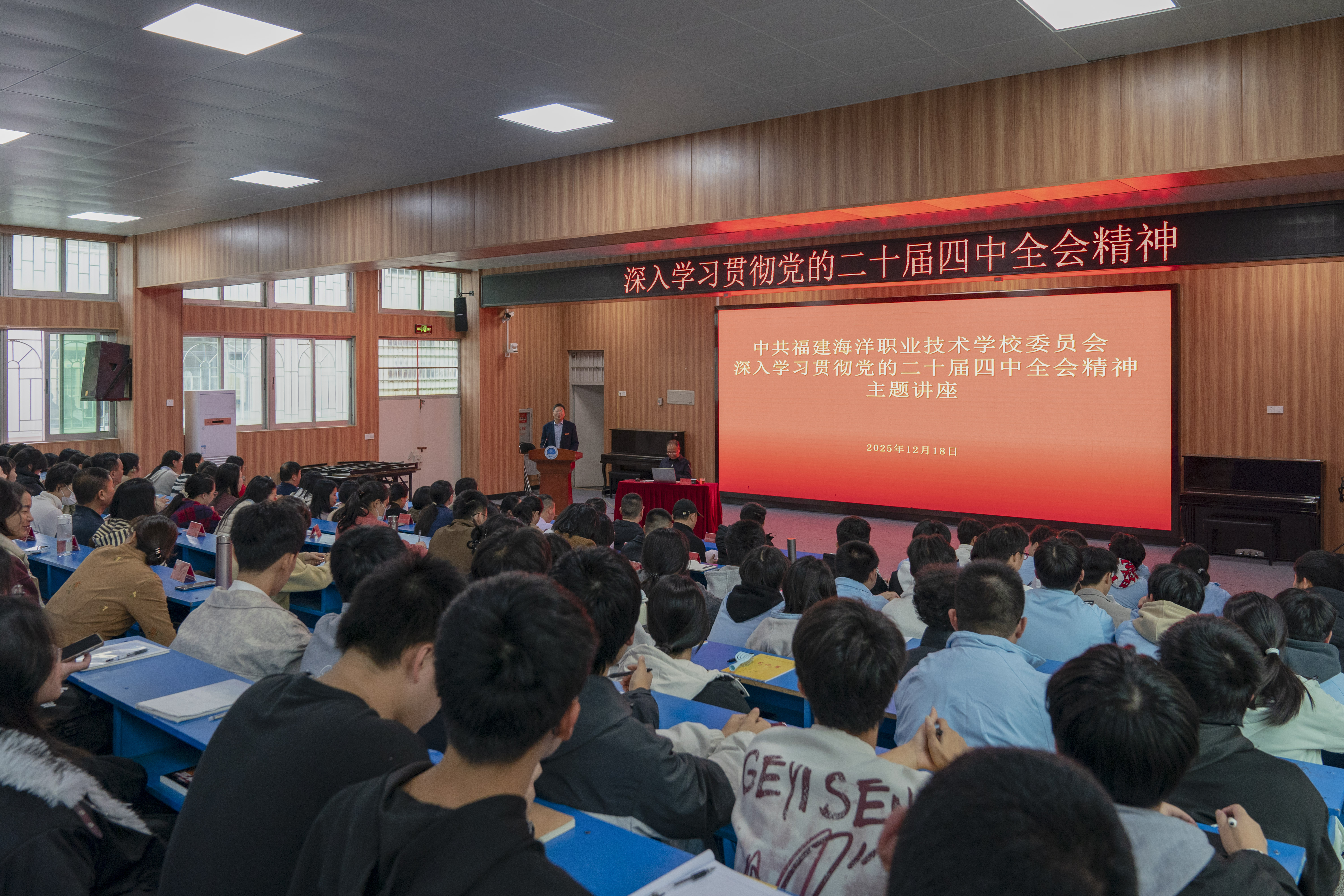 12月18日下午,一场学习贯彻党的二十届四中全会精神宣讲在福建海洋职业技术学校阶梯教室举行,校领导、党员教师及团员学生和入团积极分子等120多人,聆听省海洋与渔业局关工委常务副主任、校外讲师团成员严飞宣讲。