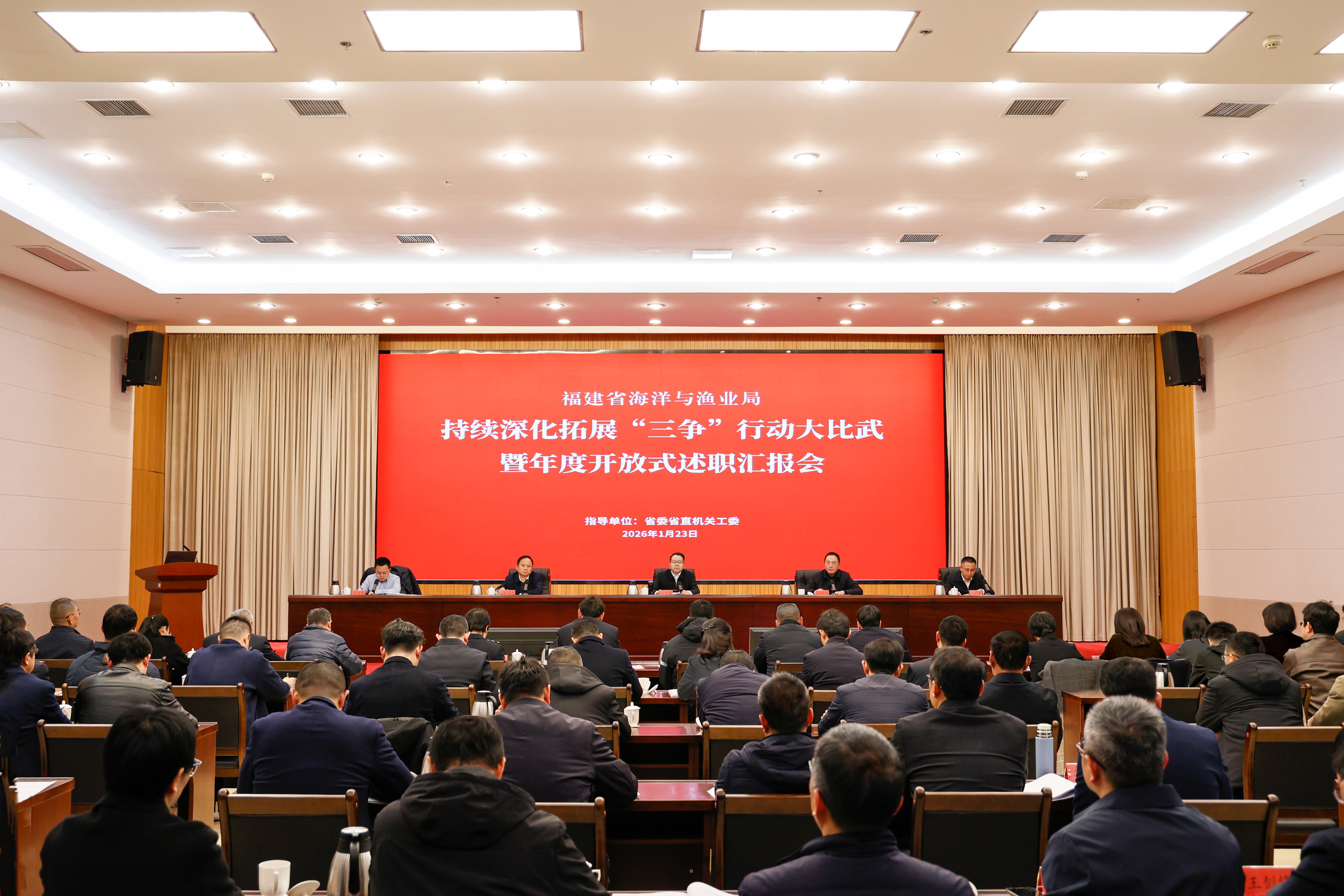 1月23日,一年一度的福建省海洋与渔业局持续深化拓展“深学争优、敢为争先、实干争效”行动大比武暨年度开放式述职汇报会在福州举行。会议深入学习贯彻习近平总书记关于海洋强国建设重要论述和在福建考察时的重要讲话精神,认真按照省委、省政府部署要求,持续深化拓展“三争”行动,立足“十五五”开局之年,激发比学赶超意识,奋力启新局、创佳绩,扎实推进高水平海上福建建设。局党组书记、局长颜志煌出席会议并讲话。省委省直机关工委一级巡视员沈燕雄现场观摩并作指导。局党组成员、驻局纪检监察组组长陈晓光作点评。局党组成员、副局长刘庆丰主持会议。