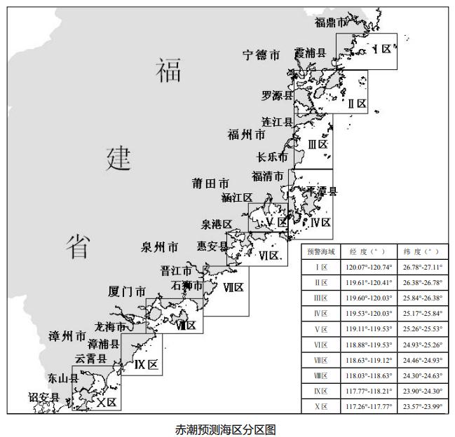 当前预报天气形势不利于我省沿海赤潮的发生。未来三天我省沿海赤潮发生条件预测等级见下表。