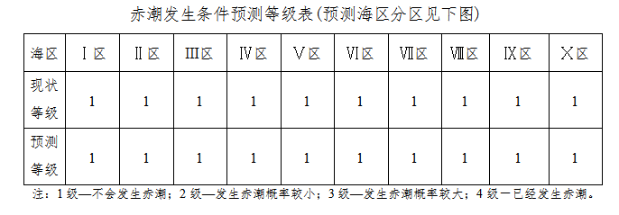 当前预报天气形势不利于我省沿海赤潮的发生。未来四天我省沿海赤潮发生条件预测等级见下表。
