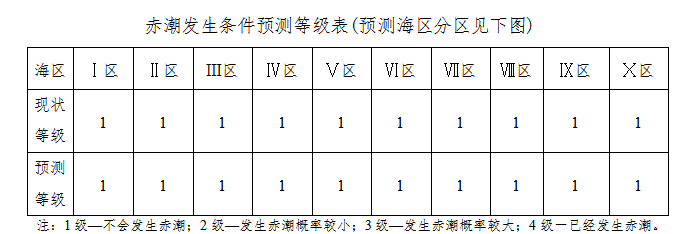 当前预报天气形势不利于我省沿海赤潮的发生。未来四天我省沿海赤潮发生条件预测等级见下表。