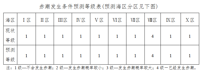 当前预报天气形势不利于厦门沿海区域赤潮的发展和其它沿海区域赤潮的发生。未来两天我省沿海赤潮发生条件预测等级见下表。